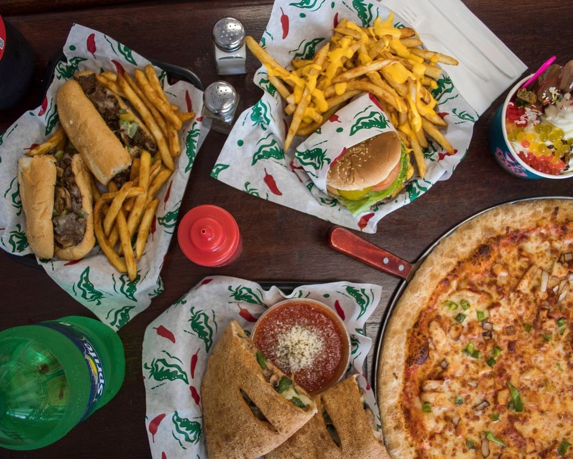 From juicy burgers with crispy fries to handcrafted pizzas, flavorful wings, ...hearty pastas, and fresh salads for the perfect balance — all topped off with irresistible sweet desserts.